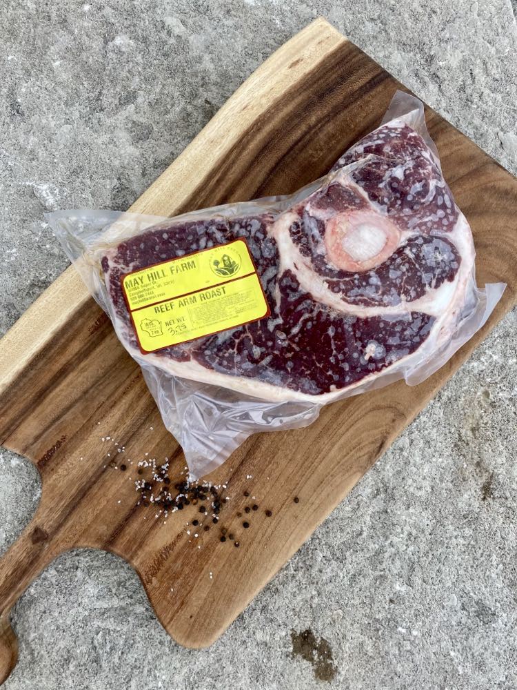 This cut from the chuck is fantastic for pot roast! This is just a knife blade away from the shoulder roast, and the main difference between the two is that the arm roast has a round bone in it and is slightly more tender. You can use this for a pot roast or cut it up for stew meat.