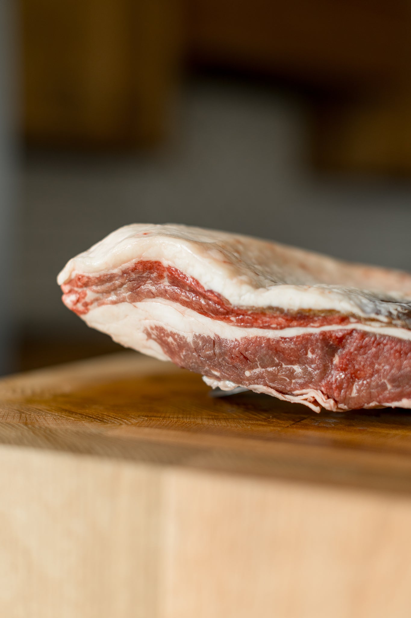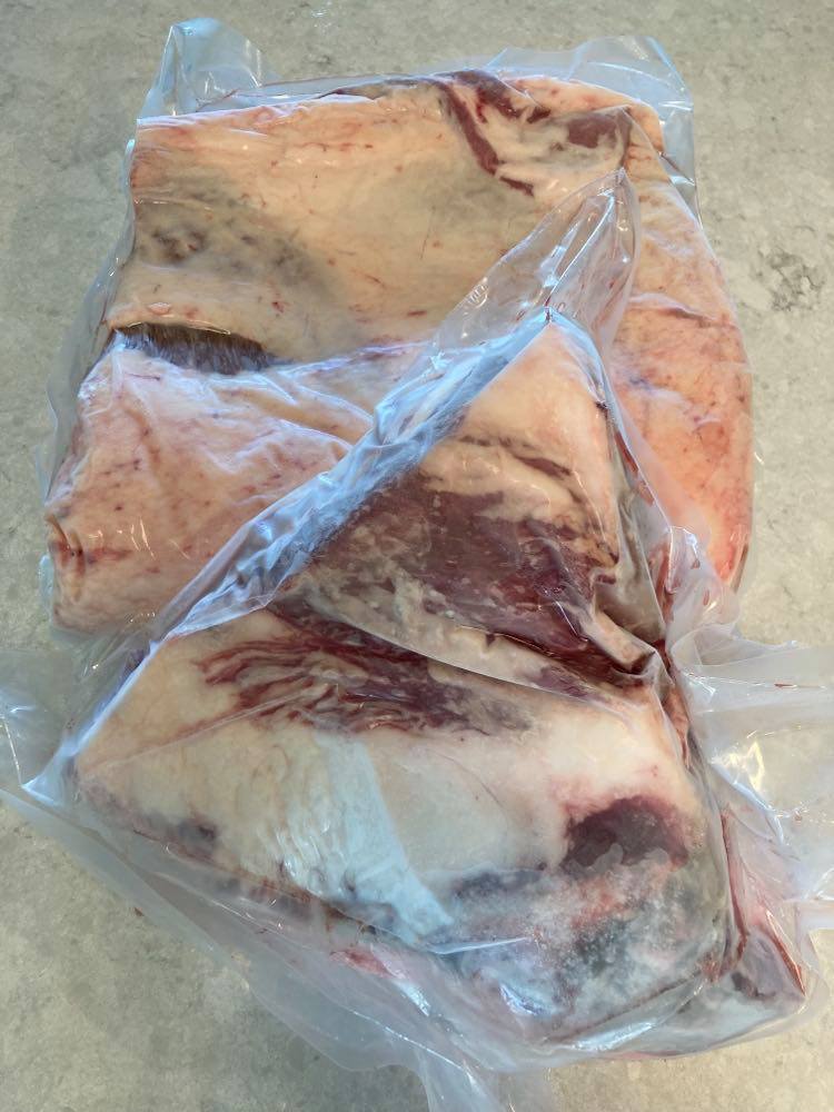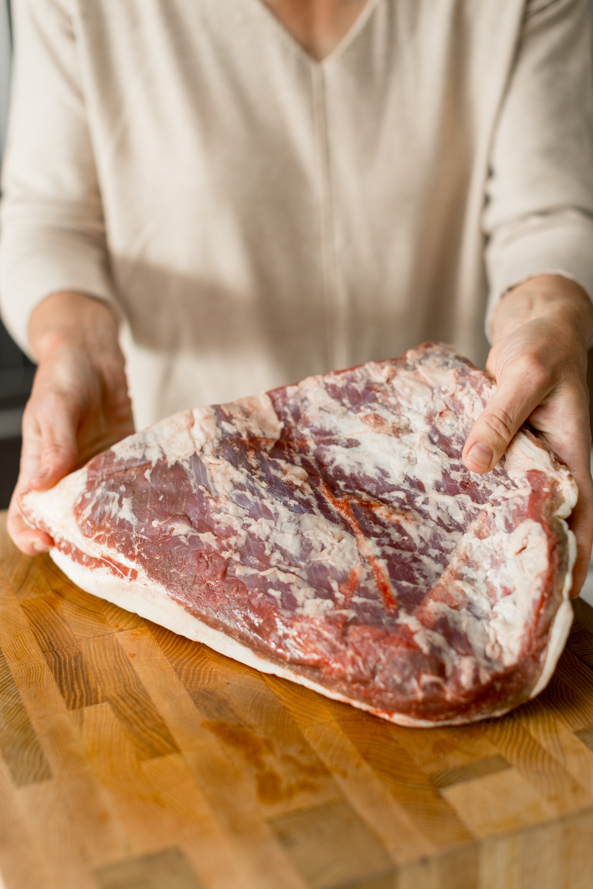 Beef brisket is from the breast section between the foreshank and plate. It contains layers of fat and lean meat, but no bones. Often cured in salt brine to make corned beef brisket, it is usually prepared by braising, smoking, or by cooking in liquid.