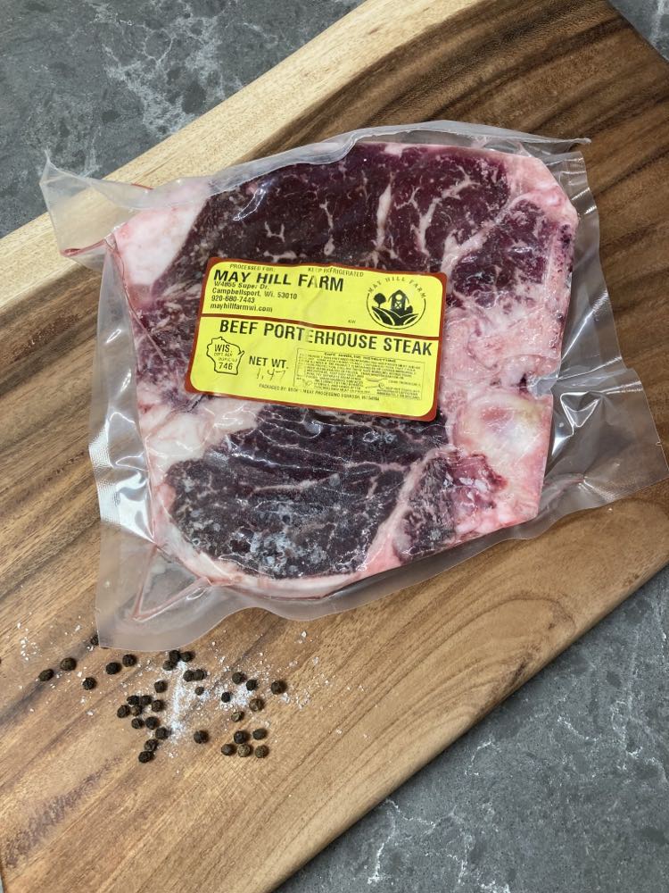 The Porterhouse is kind of a composite steak coming from the point where the tenderloin and top loin meet. It's like an over-sized T-Bone steak and has much more of the tenderloin relative to the loin portion. If you remove the bone, you will get a tenderloin steak and a New York Strip Steak. This is an excellent choice for the hearty eater, while being extremely tender and flavorful! Porterhouse steaks are cut 1" thick.