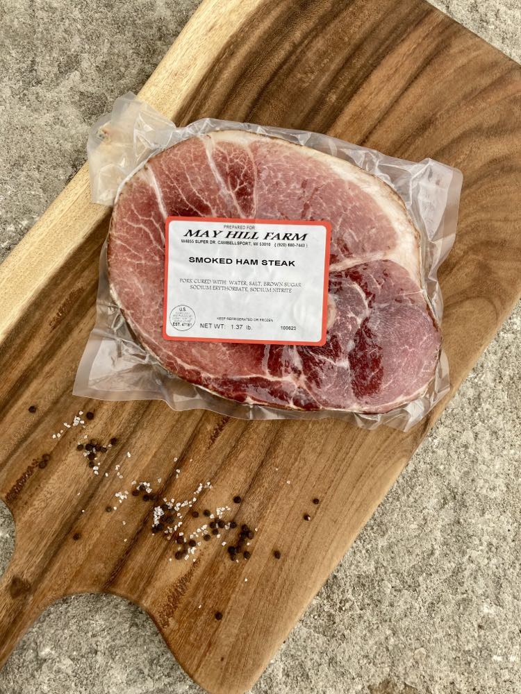 Home Cured (smoked) ham steaks are a 3/4" thick slide of a smoked ham. They make a delicious and quick dinner or can be cubed up for omelets or egg bakes.